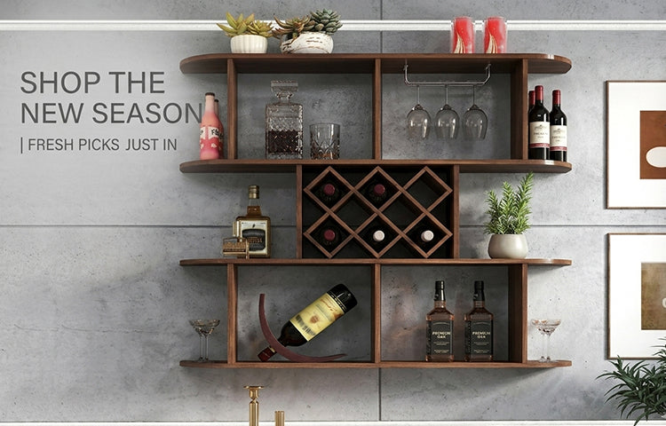 Modern Walnut Wall Mounted Wine Rack - 3-Tier Wooden Display Shelf with Stemware Glass Holder, Rustic Home Bar & Dining Room Decor